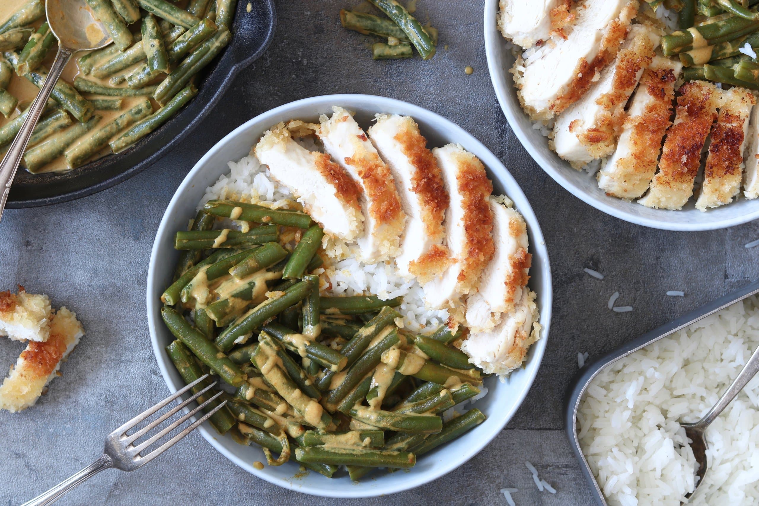 Deze oosterse variant met chicken katsu maak je met sperziebonen, gele curry, en kokosmelk. We love it!