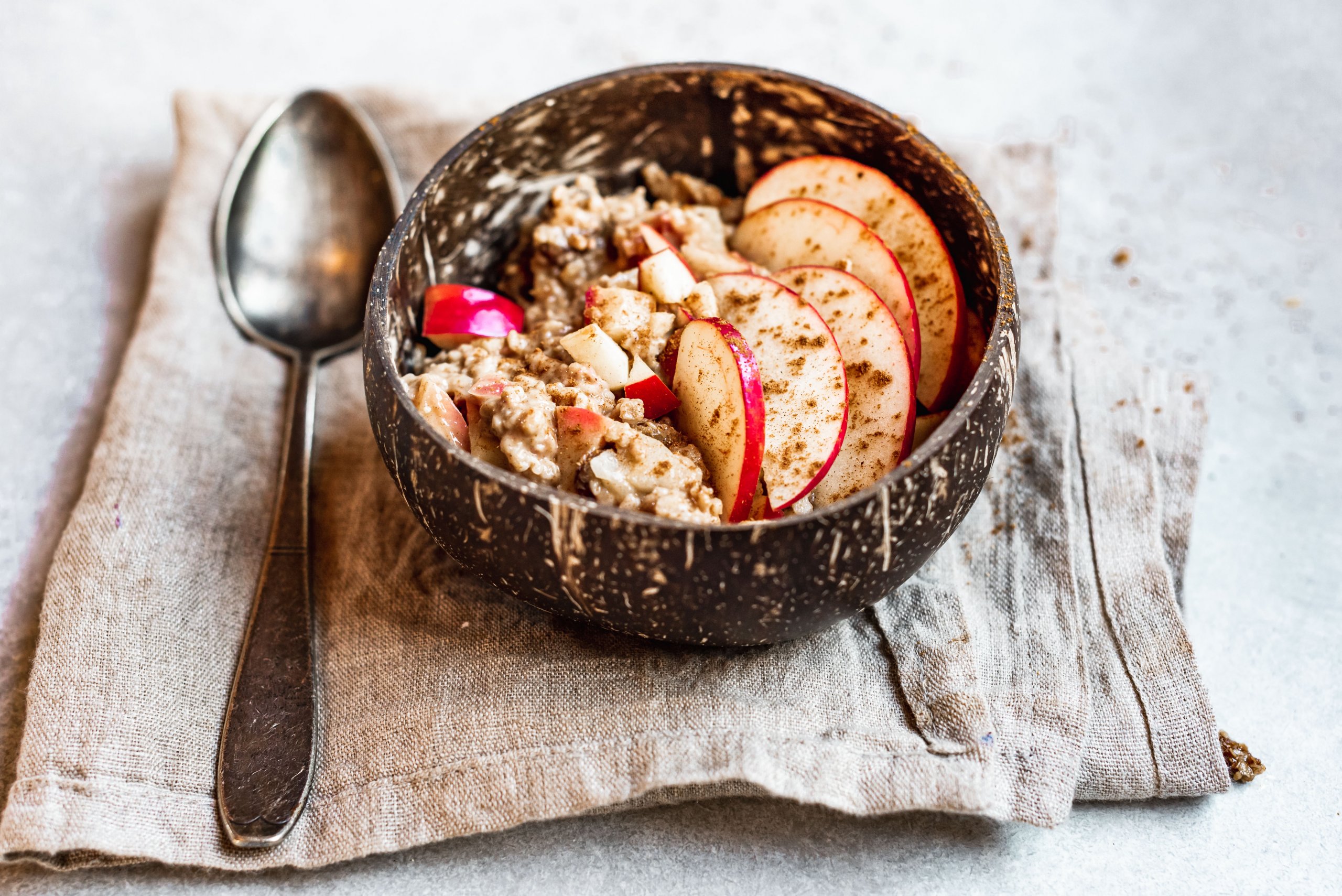 Ook voor dit comfort-ontbijtje heb je weinig ingrediënten nodig: appel, havermout, melk, rozijnen en kaneel. That’s it!