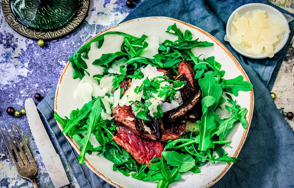 Een Italiaans feestje! Probeer eens een keertje bavette, een relatief onbekend, maar zeer smaakvol stuk vlees met een lekkere bite. Voor dit kersthoofdgerecht hebben we de bavette gecombineerd met portobello’s, rucola en pecorino.