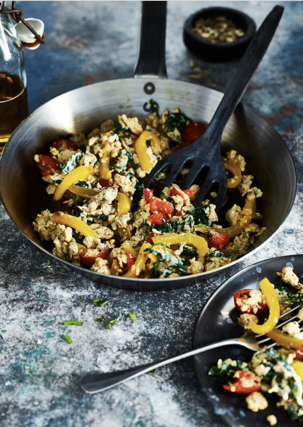 Voor de liefhebbers van een hartig ontbijt beginnen we deze lijst met een makkelijk roerei recept met onder andere paprika, spinazie en cherrytomaat. Een tópmanier om aan je dagelijkse portie groente te komen 🙂