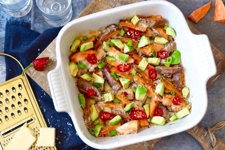 Over een twist gesproken… Deze zoete aardappelschotel bevat alle ingrediënten van een heerlijke nachoschotel. Het water loopt ons al in de mond als we denken aan deze vette hap. Laat staan als we de verantwoorde variant maken met cheddar, bosui, rode peper én avocado!