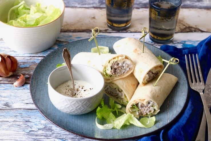 Turkse pizza’s: je kent ze wel. Die heerlijke late night snack die je weleens haalde na een avondje stappen (of misschien nog steeds wel, whaha). Geen linkje, maar zo doe je het: maak een sausje van Griekse yoghurt en knoflook. Verdeel dit over de wraps, en maak af met wat sla en gebakken gehakt. Klaar is je simpele budgetdiner.