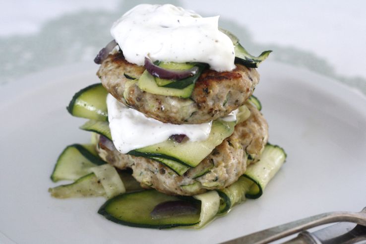 Een skinny burger, dat klinkt toch top! Daarom deze burger van kalkoen en courgette met een sausje van Griekse yoghurt en knoflook.