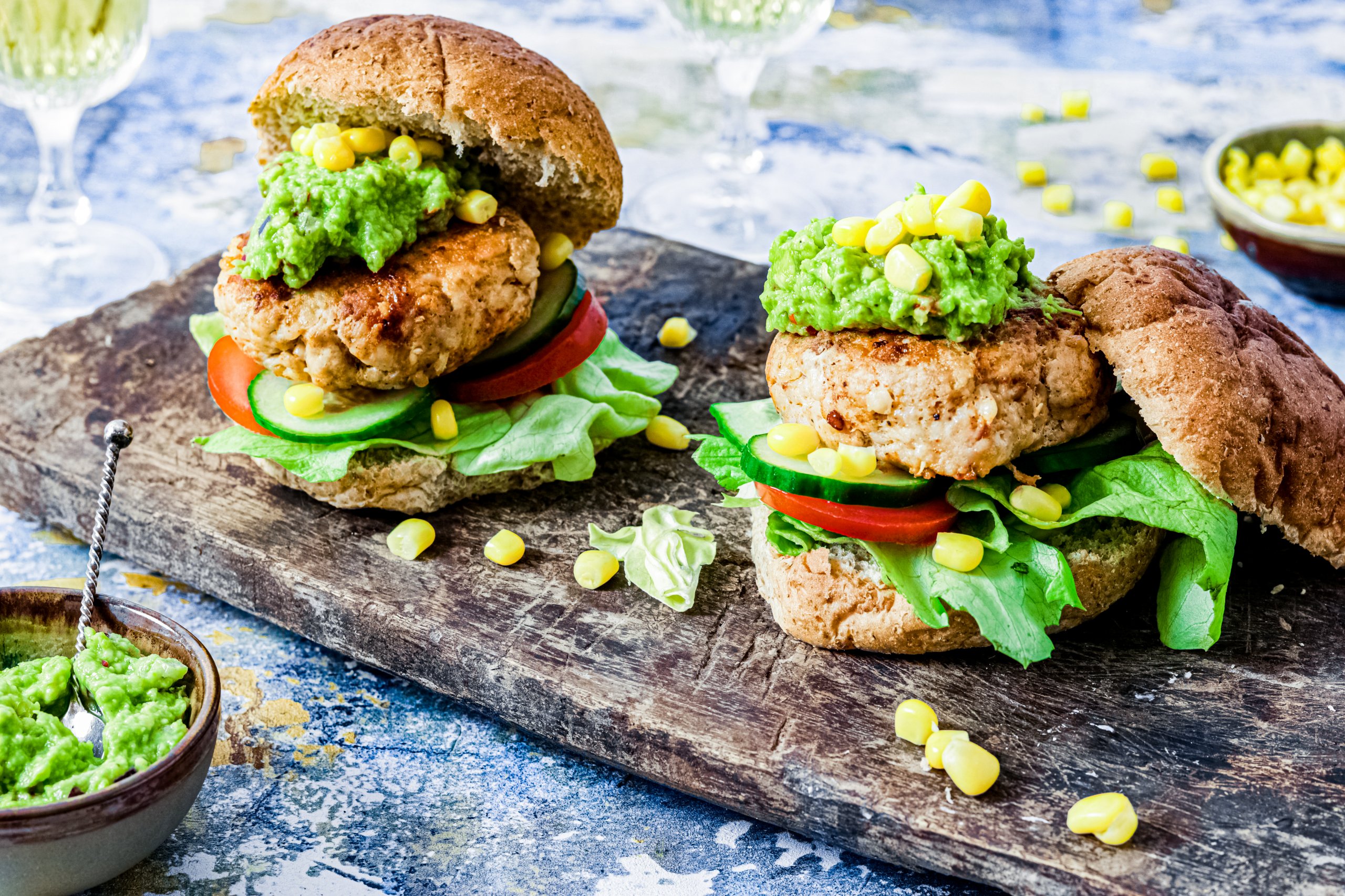 Een burger van kipgehakt in een Mexicaans jasje gestoken! Homemade guacamole mag dan zeker niet ontbreken.