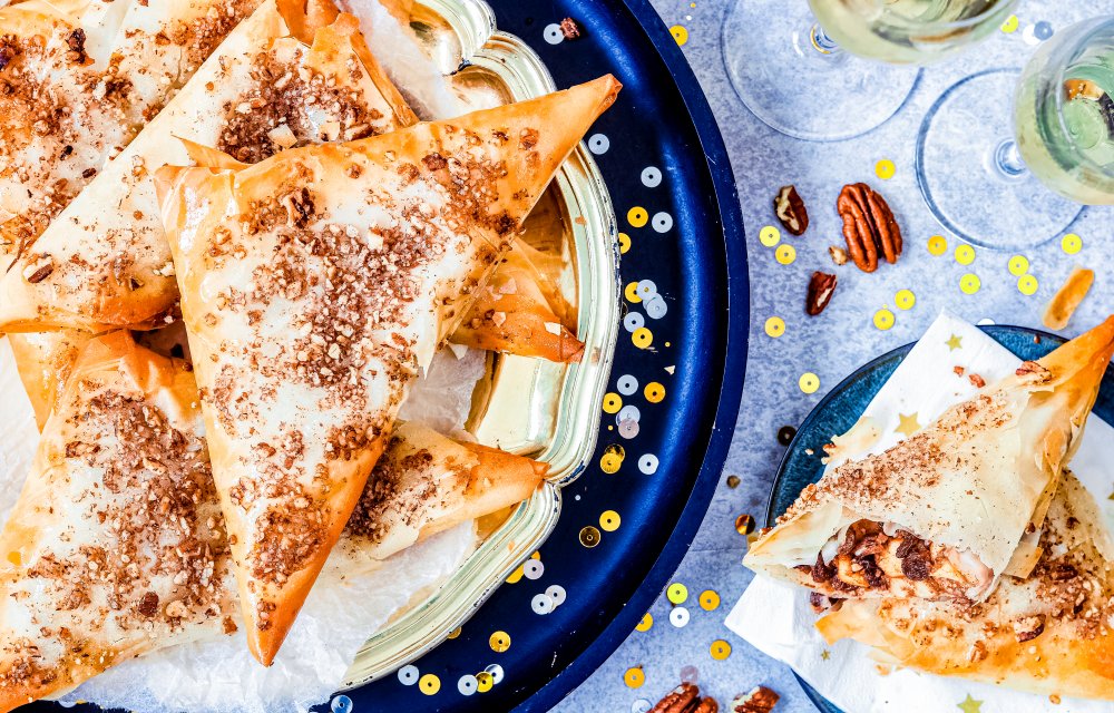 De heerlijke vulling van appel, rozijnen, pecannoten, kaneel en honing zit in een krokant jasje van filodeeg. Oftewel: een gezondere van een appelflap! Dat zijn maar 6 ingrediënten en je maakt ze in een handomdraai. Als dat geen smullen wordt!