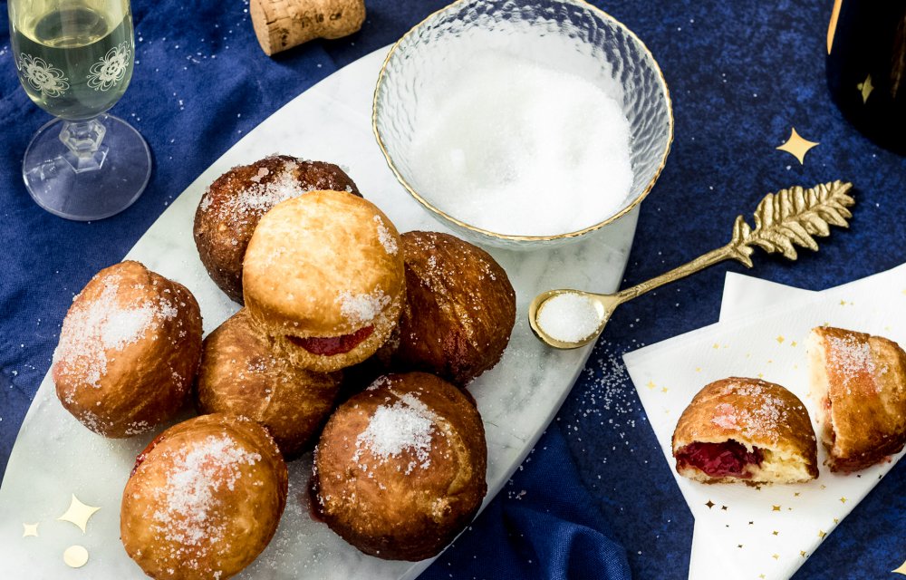 Berliner bollen, wie kent ze niet? Deze klassiekers met aardbeienjam zijn natuurlijk net zoals oliebollen ook heel feestelijk als oud & nieuw hapje!