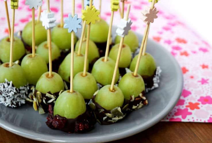 Zijn deze druifjes niet te schattig?! Heel makkelijk en snel te maken. Een bakje gesmolten chocolade, allemaal verschillende toppings… En dippen maar! Superleuk dus om samen met je kids te doen. Door healthy ingrediënten te kiezen zijn deze fruitige hapjes ook nog eens behoorlijk gezond. That’s how we like it.