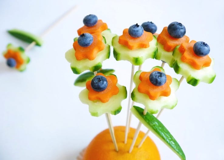 Dit vrolijke boeket is top als gezonde traktatie op een kinderfeestje of om uit te delen in de klas. Een gezellig groenteboeket van komkommer, winterpeen en blauwe bessen voor onze little ones.