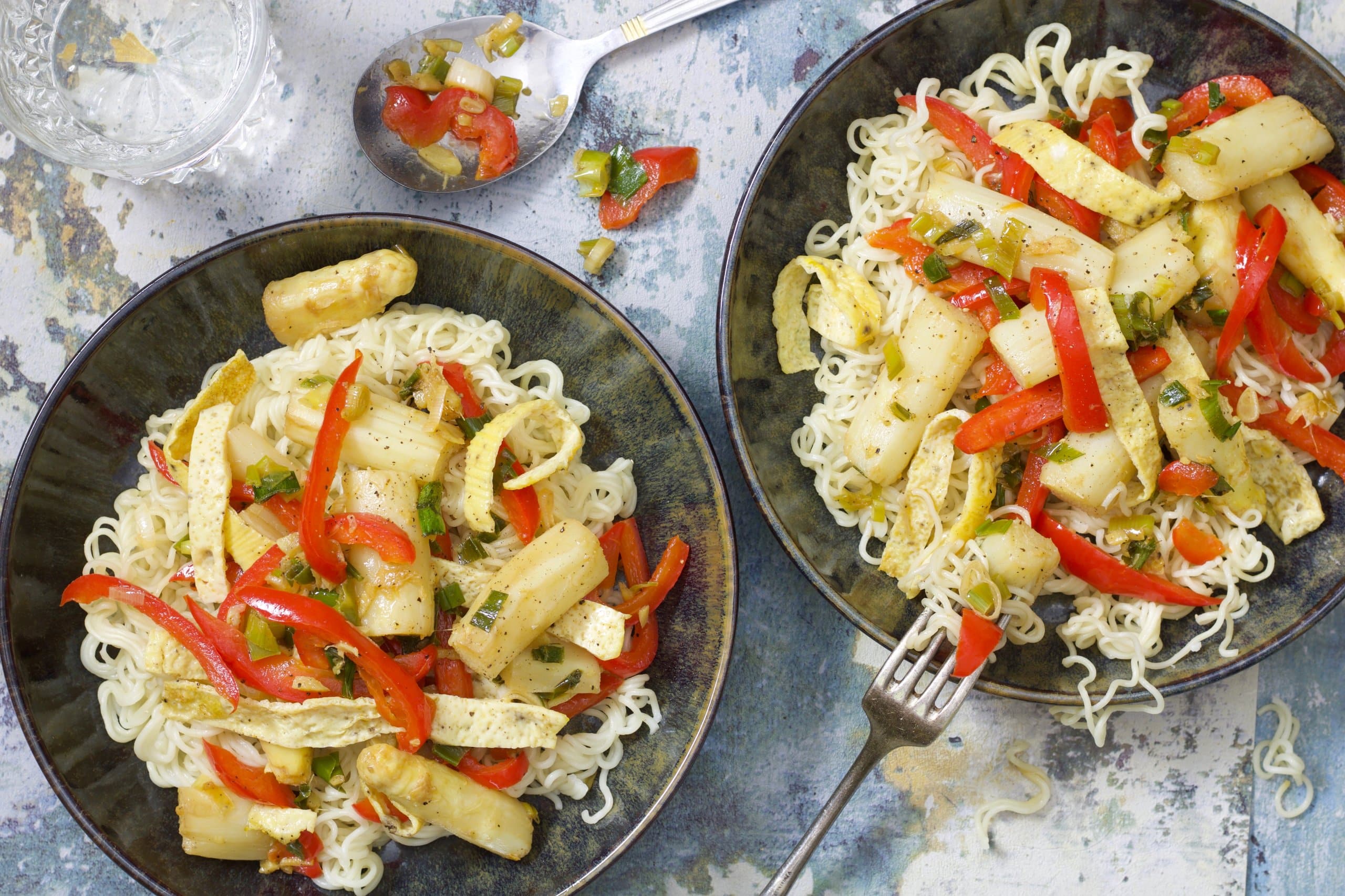 Het is gelukkig nog geen tijd om afscheid te nemen van asperges. We verwerken ze in een Aziatisch roerbakrecept met noedelsgember en ei. Aanrader hoor, deze noedels met witte asperges!