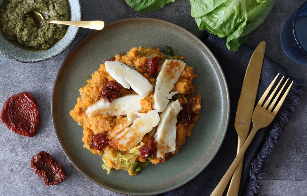 Halloumi in combinatie met onze geliefde oranje piepers kon natuurlijk niet ontbreken. Deze vegetarische stamppot maak je met wat groene pesto en zongedroogde tomaatjes.