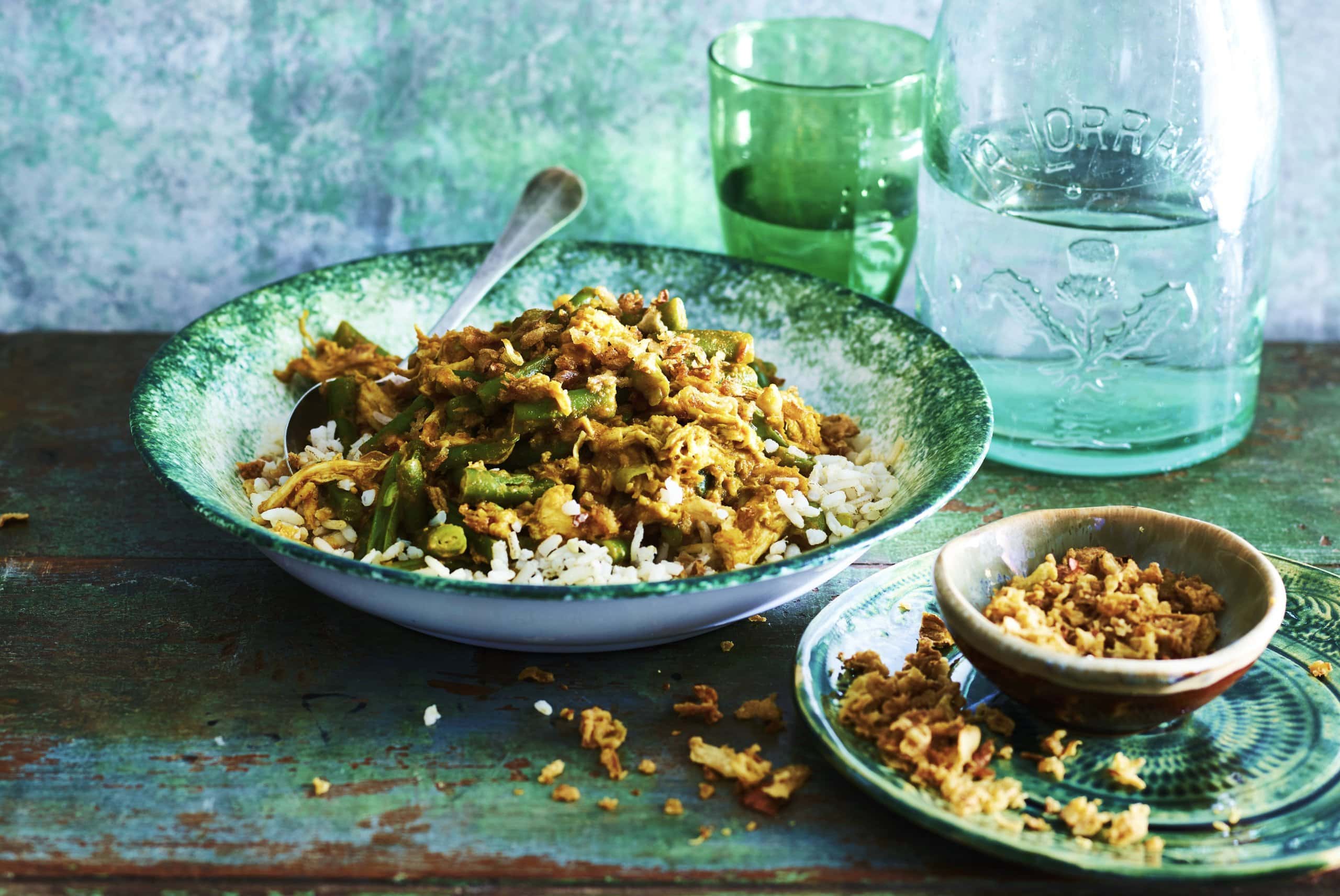 Een heerlijk gerecht met zilvervliesrijst, sperziebonen, kokosmelk, currypasta, gebakken uitjes én natuurlijk pulled chicken.
