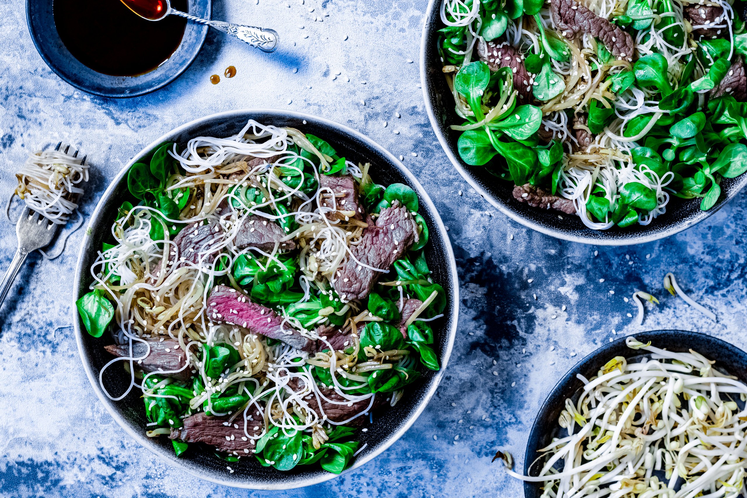 Deze skinny six salade met biefstukreepjes, mihoen en sojasaus krijgt een Aziatische twist. We weten zeker dat je er van zult genieten.