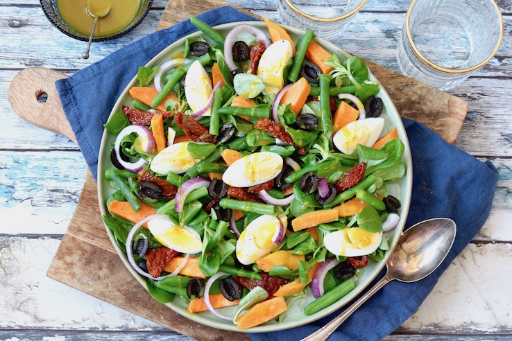 Ook zonder vis is de salade niçoise heerlijk! Wij vullen hem met andere goodies zoals zongedroogd tomaatjes en zoete aardappel.
