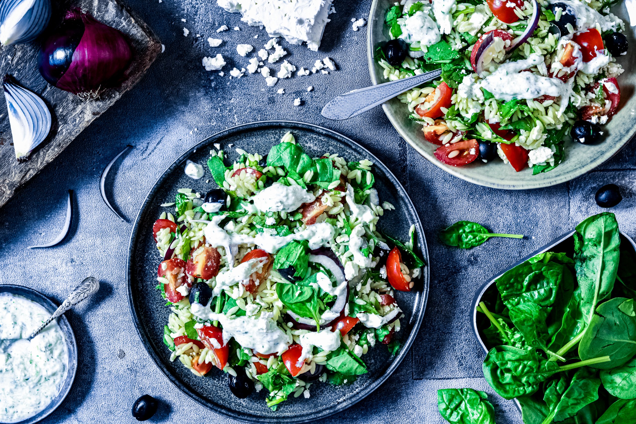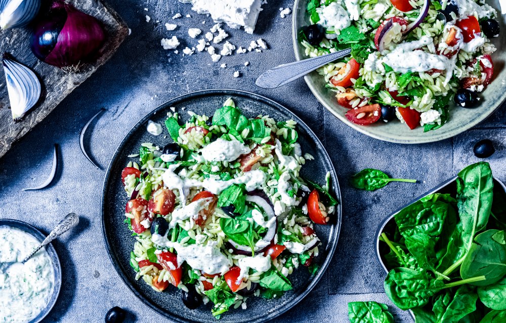 Deze healthy salade met orzo, ook wel riso genoemd, staat binnen 15 minuten op tafel. Met spinazie, rode ui en olijven maak je het compleet. Ideaal diner, maar de volgende dag ook perfect als lunch.