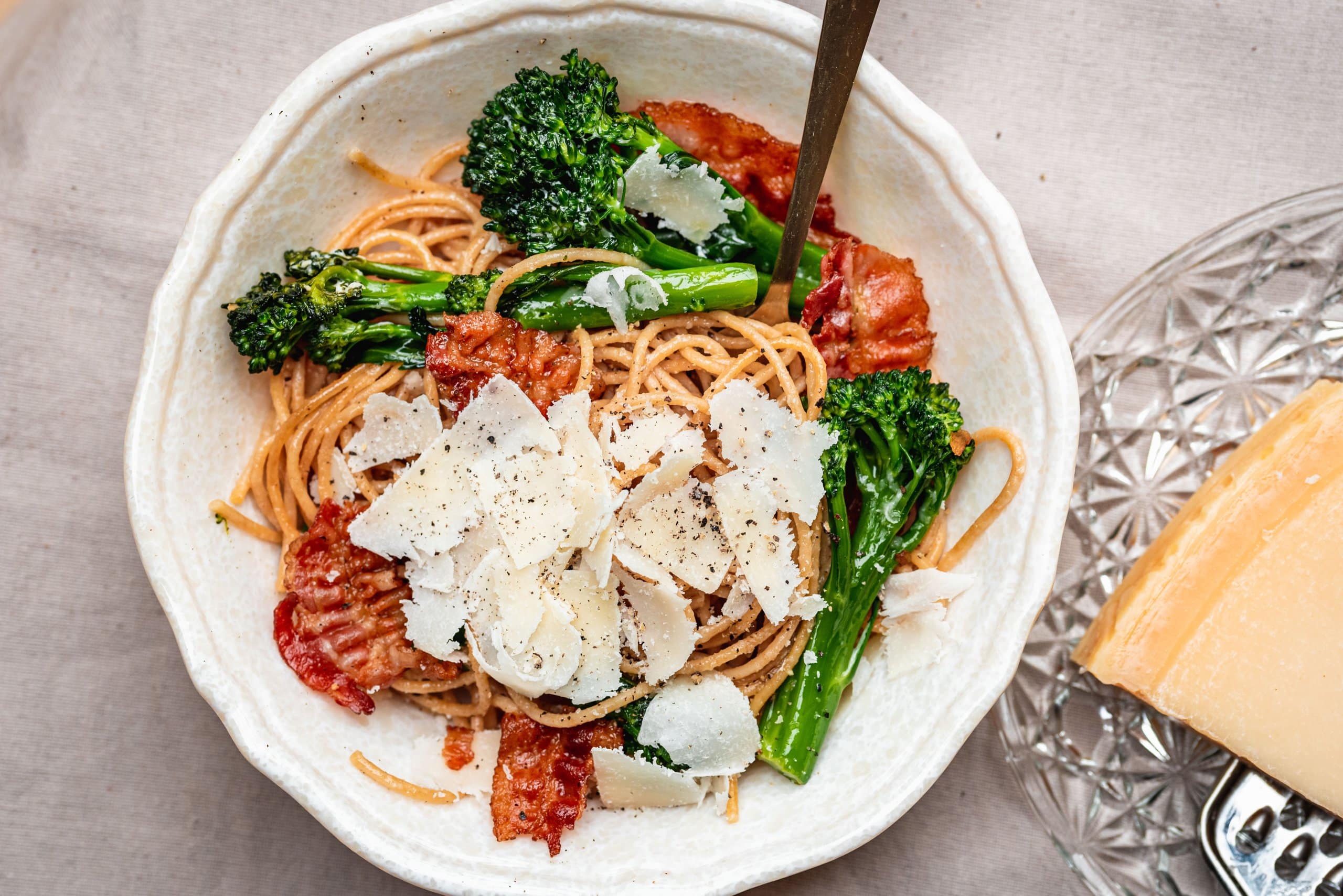 Laat je niet misleiden door de naam: deze MEGA snelle spaghetti is heerlijk in ieder seizoen! En je hebt er ook maar 4 ingrediënten voor nodig. Nou ja, dat is wat je wil voor je doordeweekse maaltijd toch? Wij in elk geval wel. Wat er in deze overheerlijke lente-spaghetti gaat? Nou, behalve natuurlijk spaghetti, gaat er ontbijtspek, bimi en Parmezaanse kaas in. En lekker dat het is.