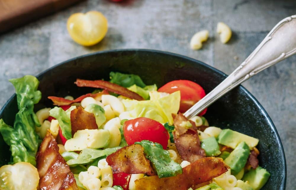 Deze supersnelle macaroni met krokante ham, sla, tomaat en avocado maak je met slechts 5 ingrediënten in tien minuten! Kook de macaroni, bak de bacon krokant, snijd de overige ingrediënten, en meng alles samen. Liever vega? Vervang de bacon door gebakken halloumi. Dit gerecht is perfect voor een snelle doordeweekse maaltijd en valt in de smaak bij jong én oud!