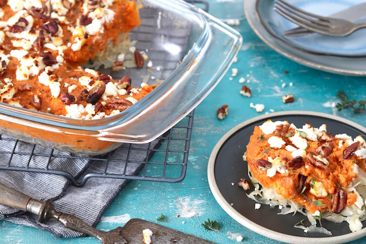 Zo’n lekkere ovenschotel met zuurkool, aardappelpuree en shoarma ken je vast wel, toch? Wij hebben er vandaag een gezondere draai aan gegeven. In plaats van gewone aardappels gaan we voor zoete aardappels en we vervangen shoarmavlees door kipfilet met shoarmakruiden. Nog wat stukjes appel door de zuurkool, een laagje pecannoten on top en dan ben je er al! In de startblokken voor deze heerlijke skinny six!