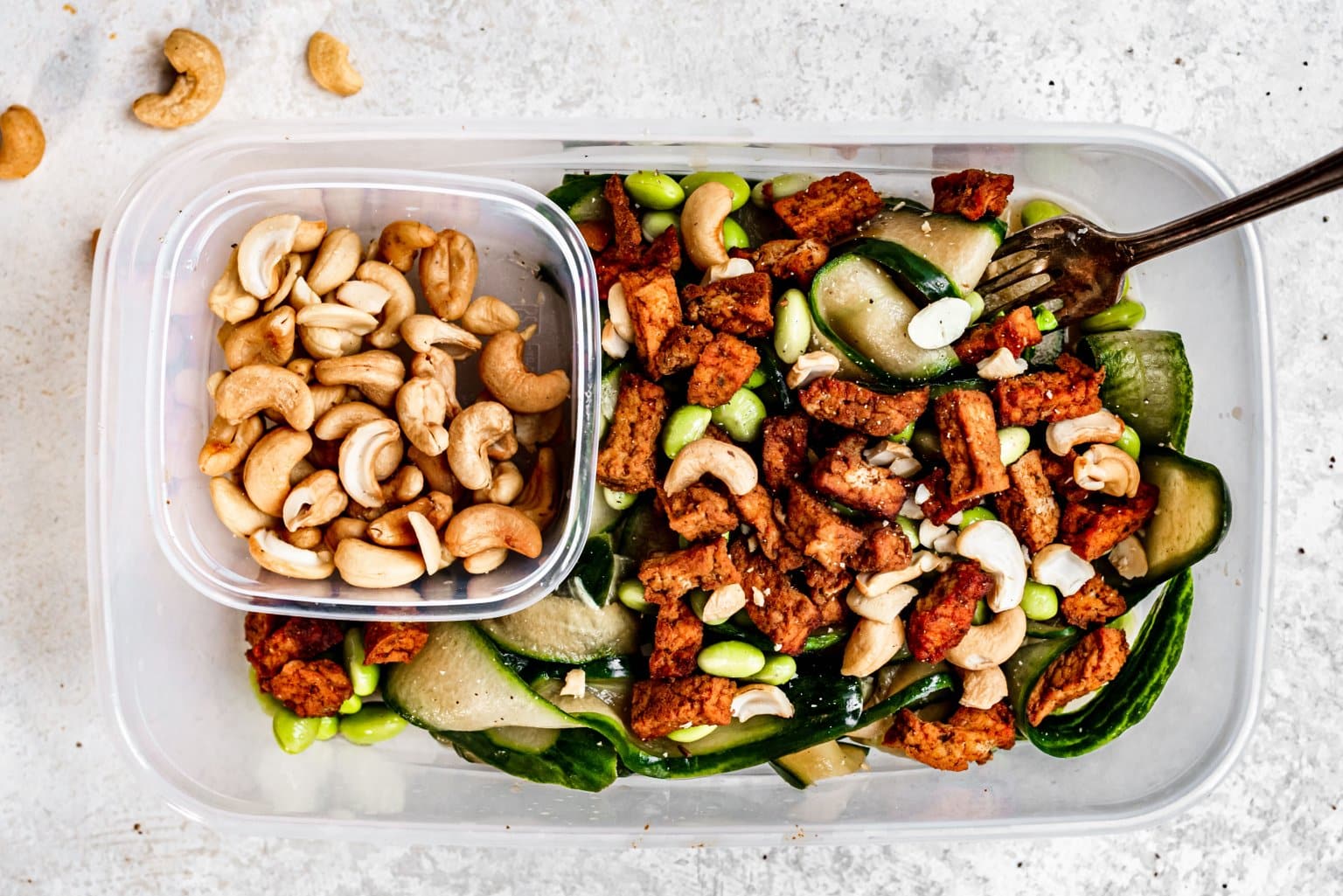 Deze Oosterse komkommersalade geeft je koolhydraatarme lunch to go meteen wat extra pit! Met pittige vegan tofu, cashewnoten en gemarineerde komkommer heb je in no time een frisse, smaakvolle lunch die je makkelijk mee kunt nemen,