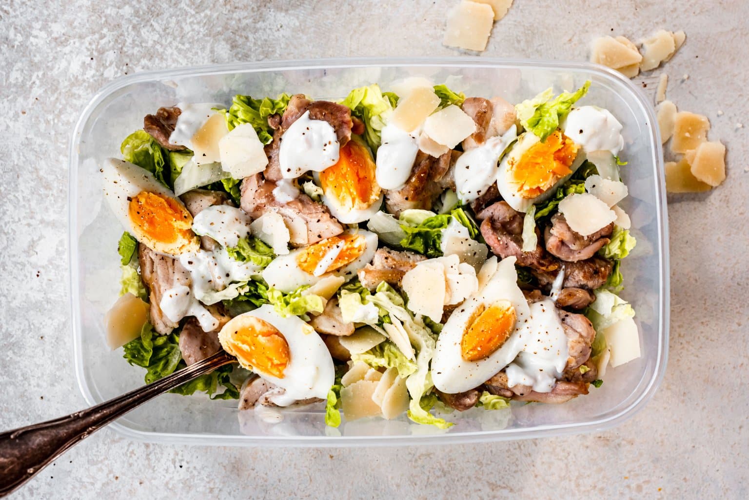 Met deze fijne caesarbowl kom jij de (werk)dag wel door. Je maakt ‘m met knapperige romaine sla, (vega)kipfilet en een gekookt eitje – yes please! Oh, en vergeet de zelfgemaakte dressing van Griekse yoghurt niet, mmmm. Perfect om vooraf te preppen!