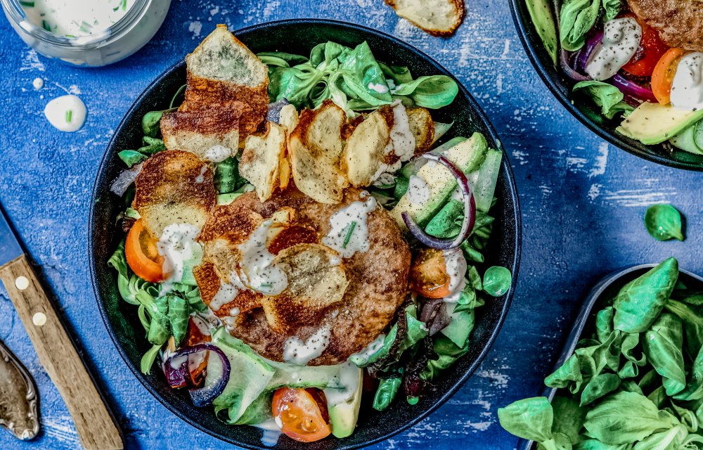 Wij steken deze salade in een nieuw jasje door middel van aardappelcrisps, komkommerslierten en een heerlijke mayonaise-yoghurtsaus. Gezond fastfood to the max ;).