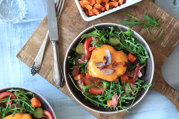 Gezonder fastfood waarvan je niet hoeft uit te buiken en ook nog ruimte hebt voor een dessert! Wie wil dat nou niet? Deze heerlijke salade bevat natuurlijk een hamburger (een vega burger kan ook) en verder sla, cheddar, rode ui, tomaat, augurk en bacon. Maak er je eigen feestje van!