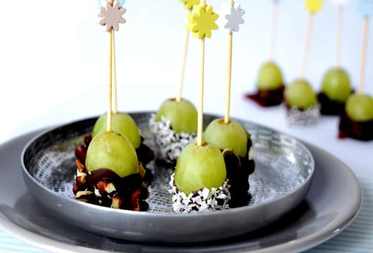 Nog een traktatie die je makkelijk samen met de kids kunt maken. De druivenpops dip je in de chocolade en maak je vervolgens af met één van de vele toppings. Van gedroogde cranberry’s tot geraspte kokos, het kan van alles zijn.