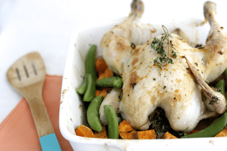 Mocht je nog op zoek zijn naar een diner waarvoor je niet lang in de keuken hoeft te staan, ga dan voor deze hele kip met zoete aardappel en sugar snaps. Het is heel makkelijk om te maken en je hebt er maar 5 ingrediënten voor nodig, hoe fijn!