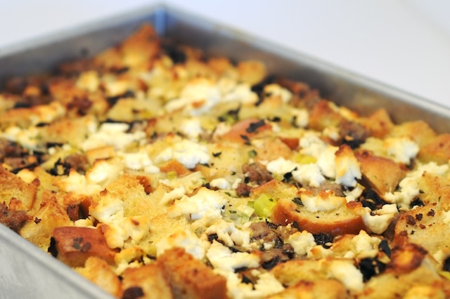 Naast de kalkoen wordt de 'stuffing' geserveerd, bestaande uit brood, knoflook, champignons, stukjes worst, kruiden en kaas