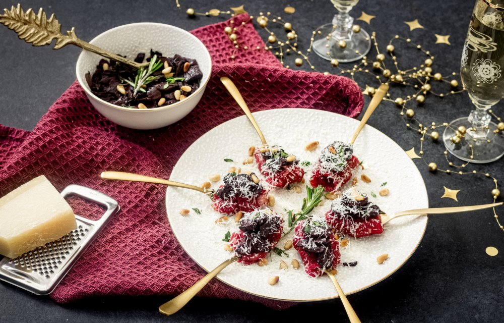 – Schep dan een eetlepel van de portsaus met paddestoelen op de carpaccio en bestrooi het vorkje tenslotte met wat parmezaanse kaas.