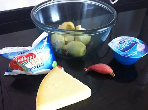 – Doe de artisjokharten samen met het sjalotje in een keukenmachine (of in een kom en vervolgens de staafmixer) en maal kort tot een grof mengsel.