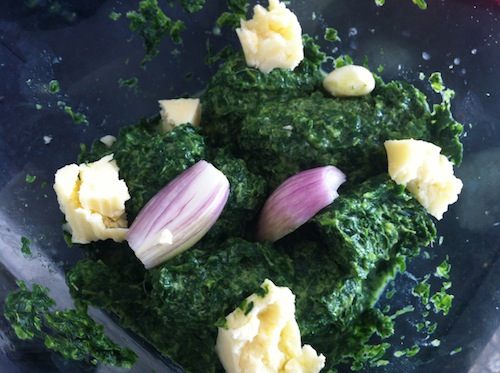 – Doe de spinazie samen met het sjalotje en de helft van de parmezaan in een keukenmachine (of in een kom en vervolgens de staafmixer) en maal kort tot een grof mengsel.