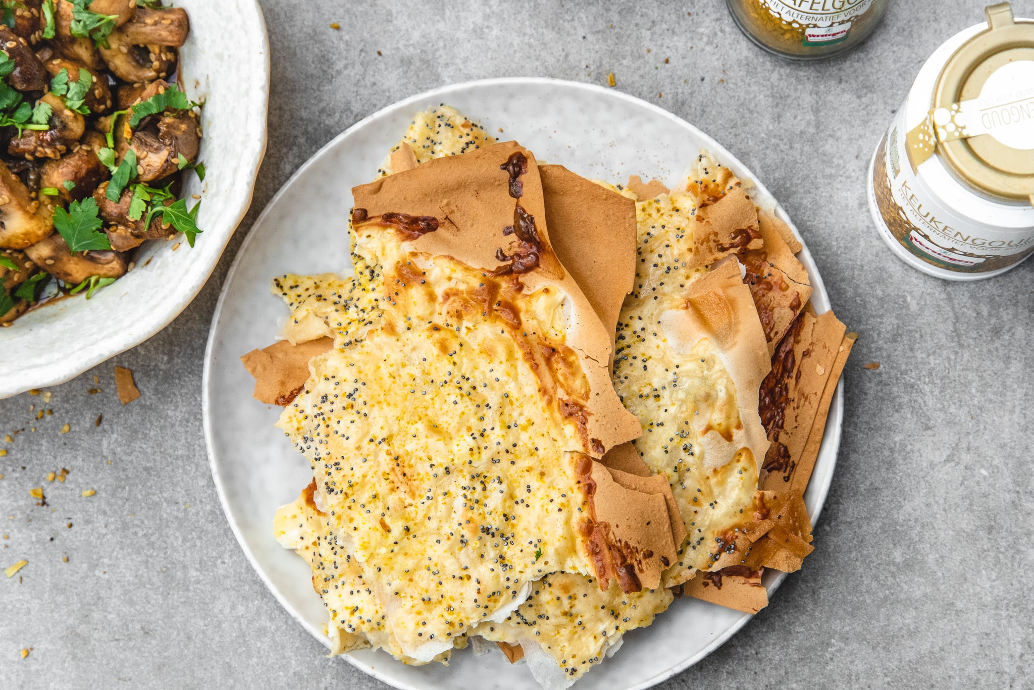 – Haal de vellen uit de oven en breek tenslotte in stukken. Serveer in een schaaltje.