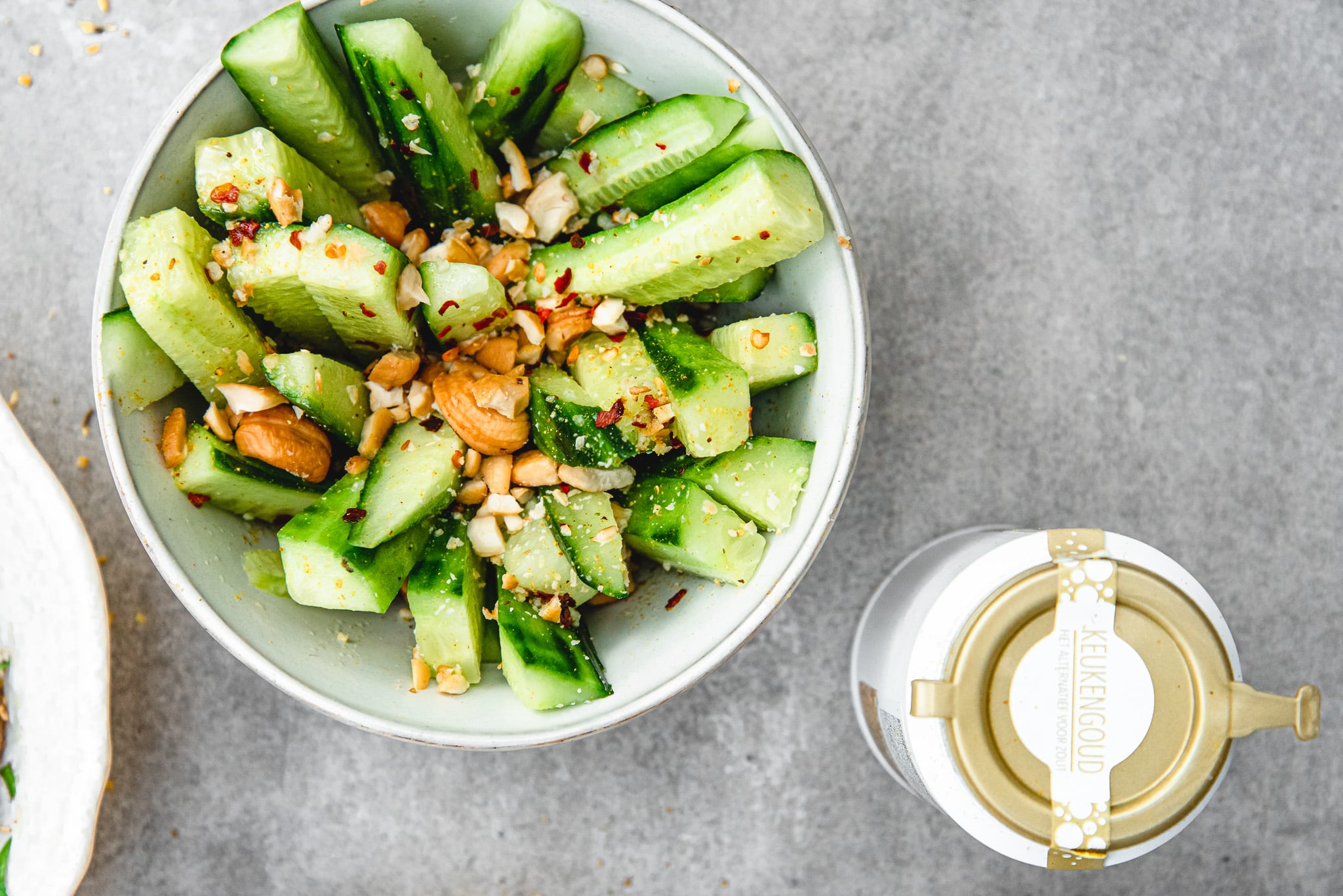 – Hak daarna de cashewnoten grof en maak de komkommersnack tenslotte af met de gehakte cashews. Eet met stokjes of kleine vorkjes!