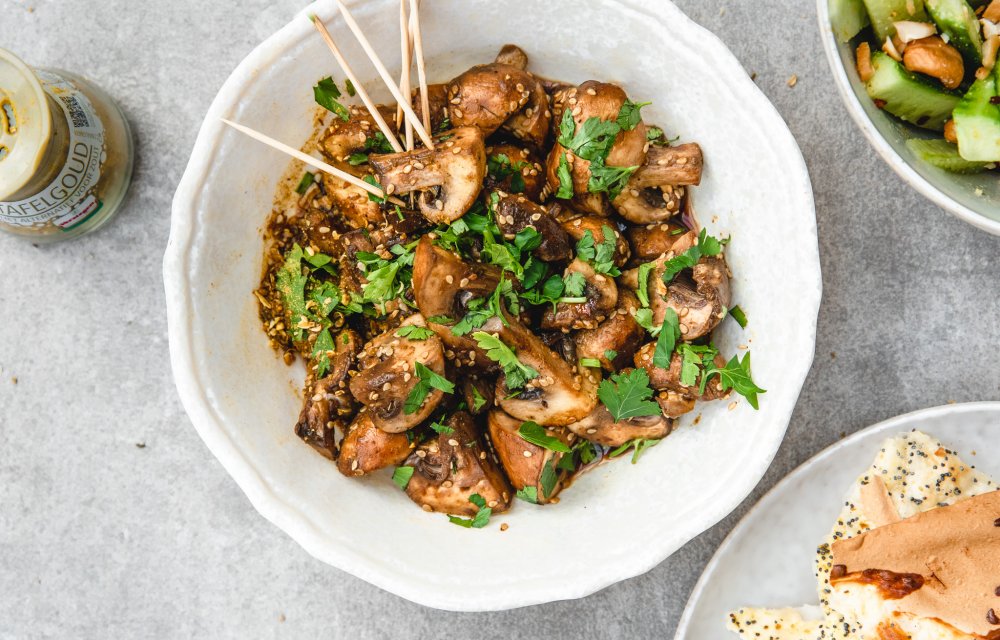 – Haal de champignons uit de pan en schep in een bakje, maak af met de platte peterselie en tenslotte de tweede tl Keukengoud. Serveer met kleine vorkjes of een cocktailprikker.