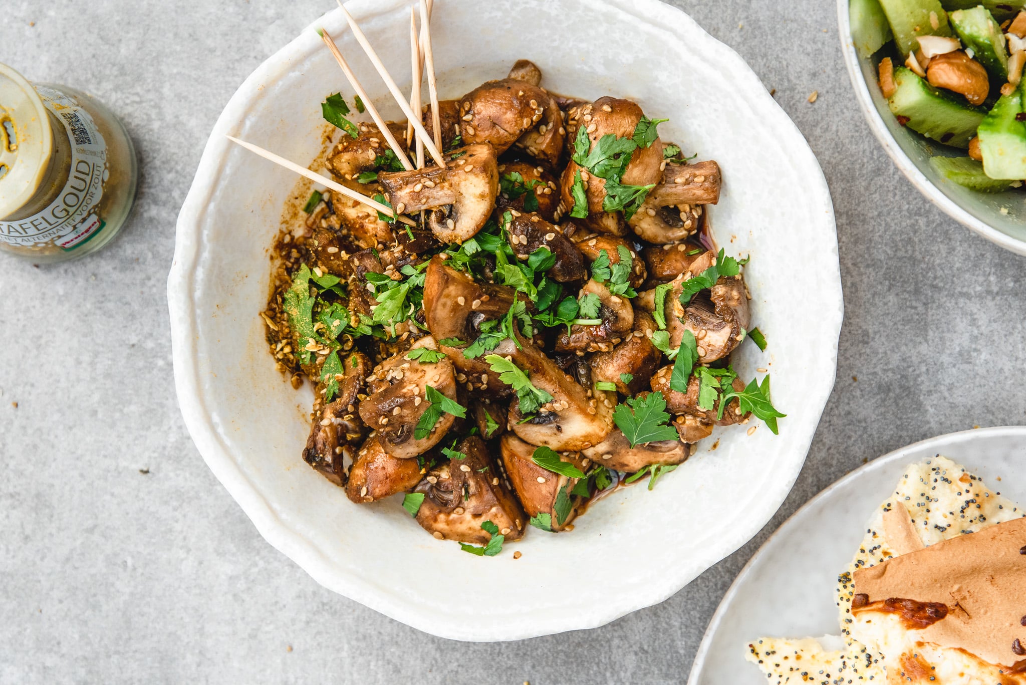 – Verwarm vervolgens een scheutje olie in een koekenpan en doe hierna de champignons in de pan, gevolgd door de ketjap Manis, 1 tl Keukengoud en tenslotte de sesamzaadjes. Bak vervolgens even op hoog vuur tot de champignons goudbruin kleuren, zet hierna het vuur lager en bak de champignons vervolgens nog 5 minuten.