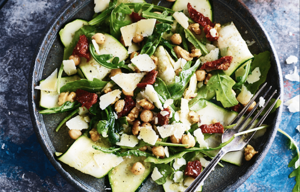 Deze salade met courgette en kikkererwten is zó easy. Het enige wat je nodig hebt is een kaasschaaf en 5 minuten van je tijd. Maak maar vast wat extra, want je collega’s willen hier sowieso van meesmullen!