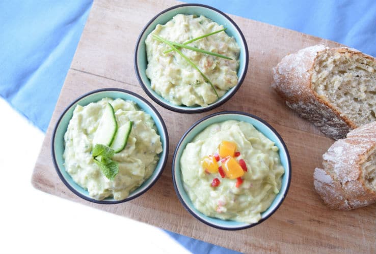 Ik had een heerlijk vers brood met rozemarijn gekregen en daar wilde ik iets lekkers bij. Nu vind ik avocado met wat peper eigenlijk altijd perfect als beleg. Maar met een klein beetje extra moeite maak je deze smeerseltjes die toch nét wat specialer zijn. En als borrelhap zijn ze ook heerlijk! Zet de verschillende smaakjes op tafel en iedereen kan lekker kiezen en dippen. Komen ze!