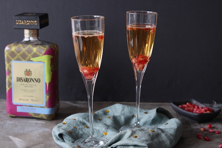 Zo feestelijk, dit heerlijke bubbeldrankje, maar dan met een twist. Doe wat granaatappelpitjes onder in een flute en schenk er achtereenvolgens 25 ml Disaronno en 75 ml Prosecco bij.