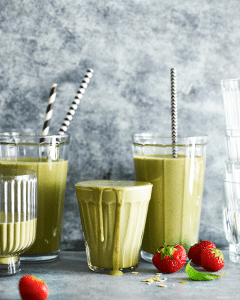 - Doe de aardbeien samen met de basilicum, komkommer, spinazie, havermout en Griekse yoghurt in een blender en maal tot een gladde smoothie.