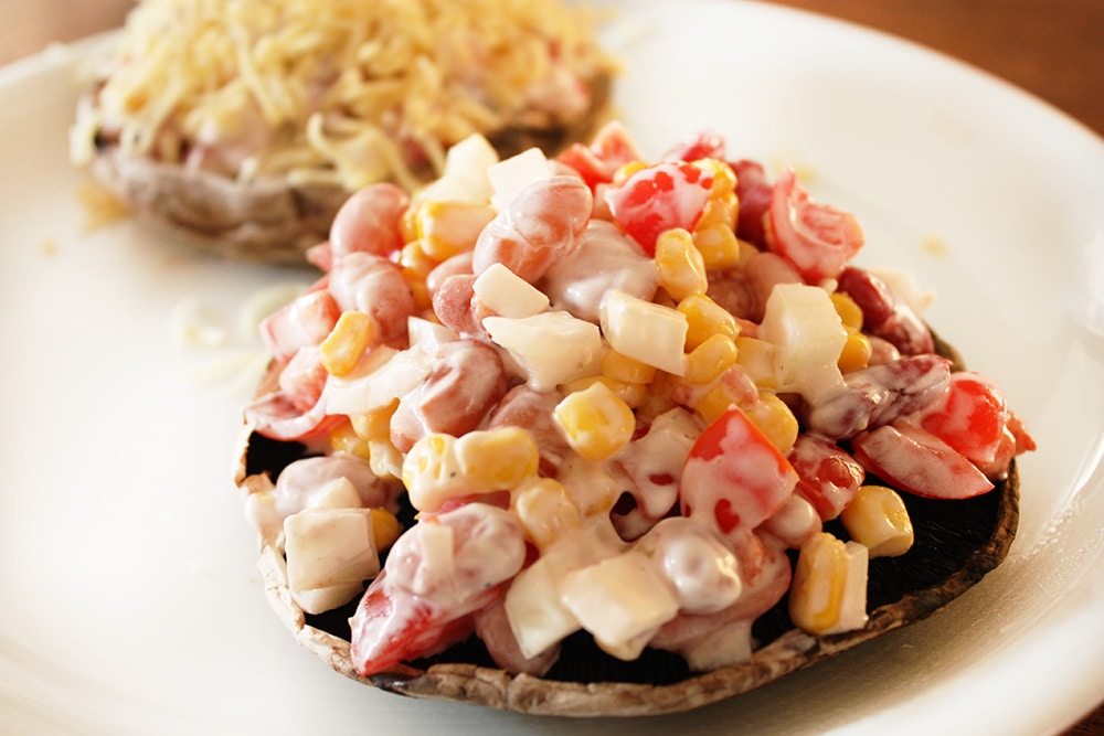– Haal je portobello’s uit de oven en vul met het mengsel.