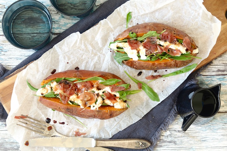 Deze keer vullen we de zoete aardappel met rucola, uitgebakken parmaham, burrata en balsamico-azijn. Een zalige combi als je het ons vraagt.