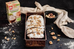 – Laat het bananenbrood volledig afkoelen. Smeer dan de kwark over de bovenkant en maak af met de rest van de walnoten.
