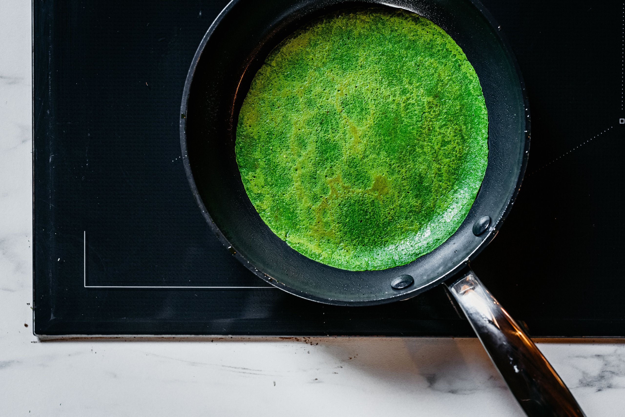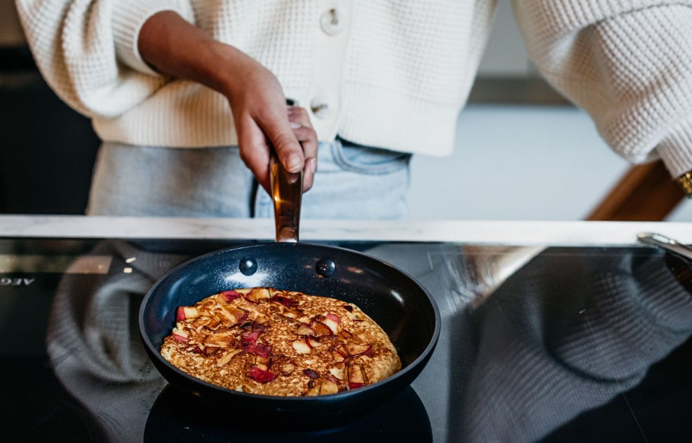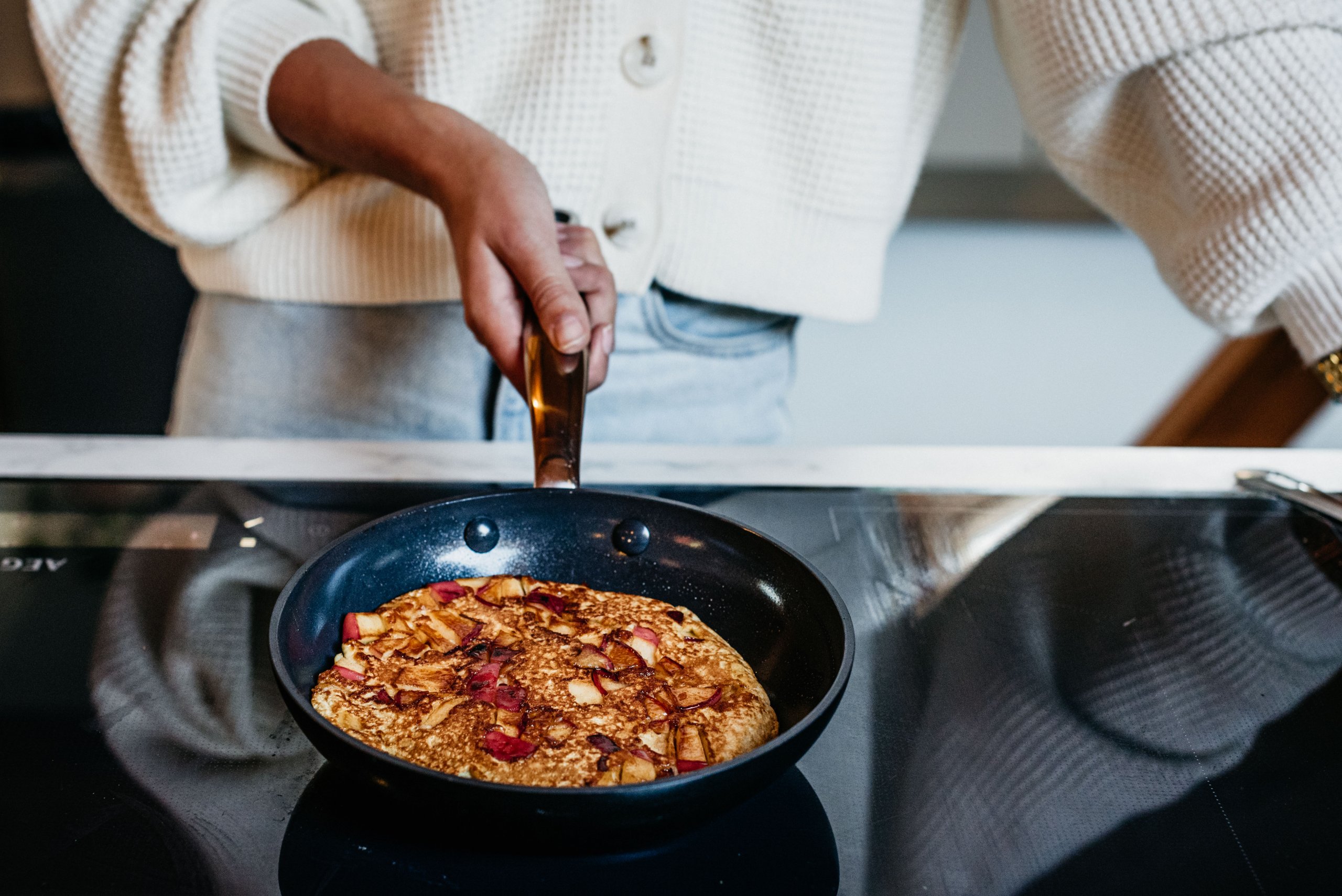 – Verhit een klein scheutje olie in de GreenPan Barcelona Black Keramische anti-aanbakkoekenpan en giet hier een kwart van het beslag in. Bak de pannenkoek op middelhoog vuur zo’n 2-3 minuten tot de bovenkant droog is. Draai de pannenkoek om en bak hem nog een minuutje aan de andere kant.