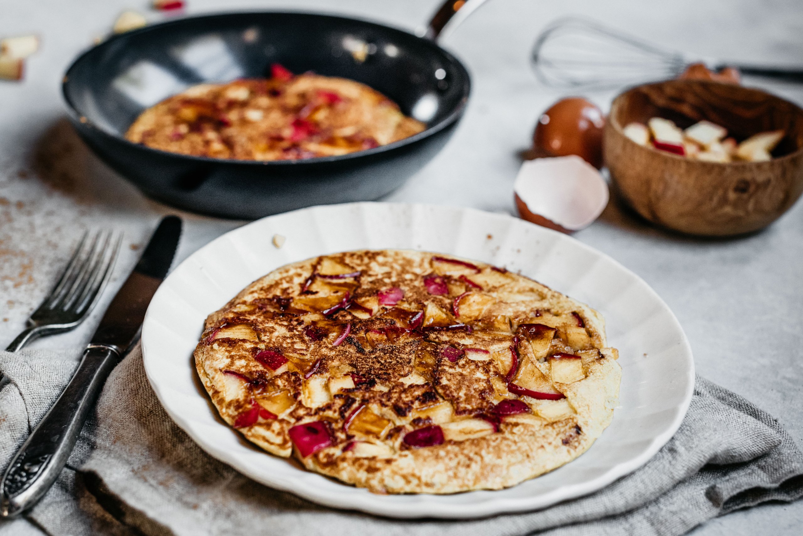 – Giet een kwart van het beslag over de appel en bak de pannenkoek op middelhoog vuur 2-3 minuten tot de bovenkant droog is. Draai de pannenkoek om en bak nog een minuutje aan de andere kant.