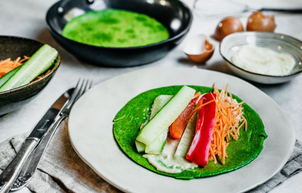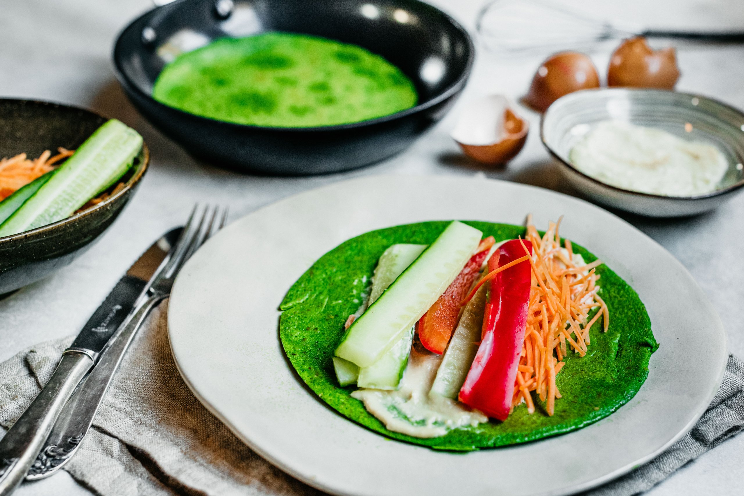 – Verdeel de hummus en de groenten over de pannenkoeken, rol ze op en serveer.