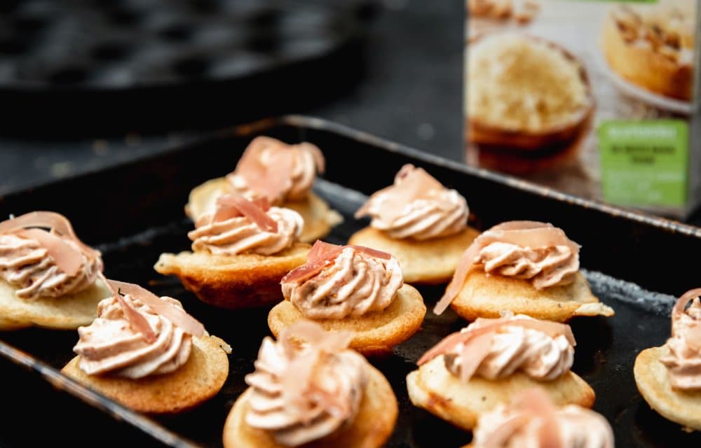 – Snijd de serranoham in reepjes en en maak de blini’s af met een reepje ham.