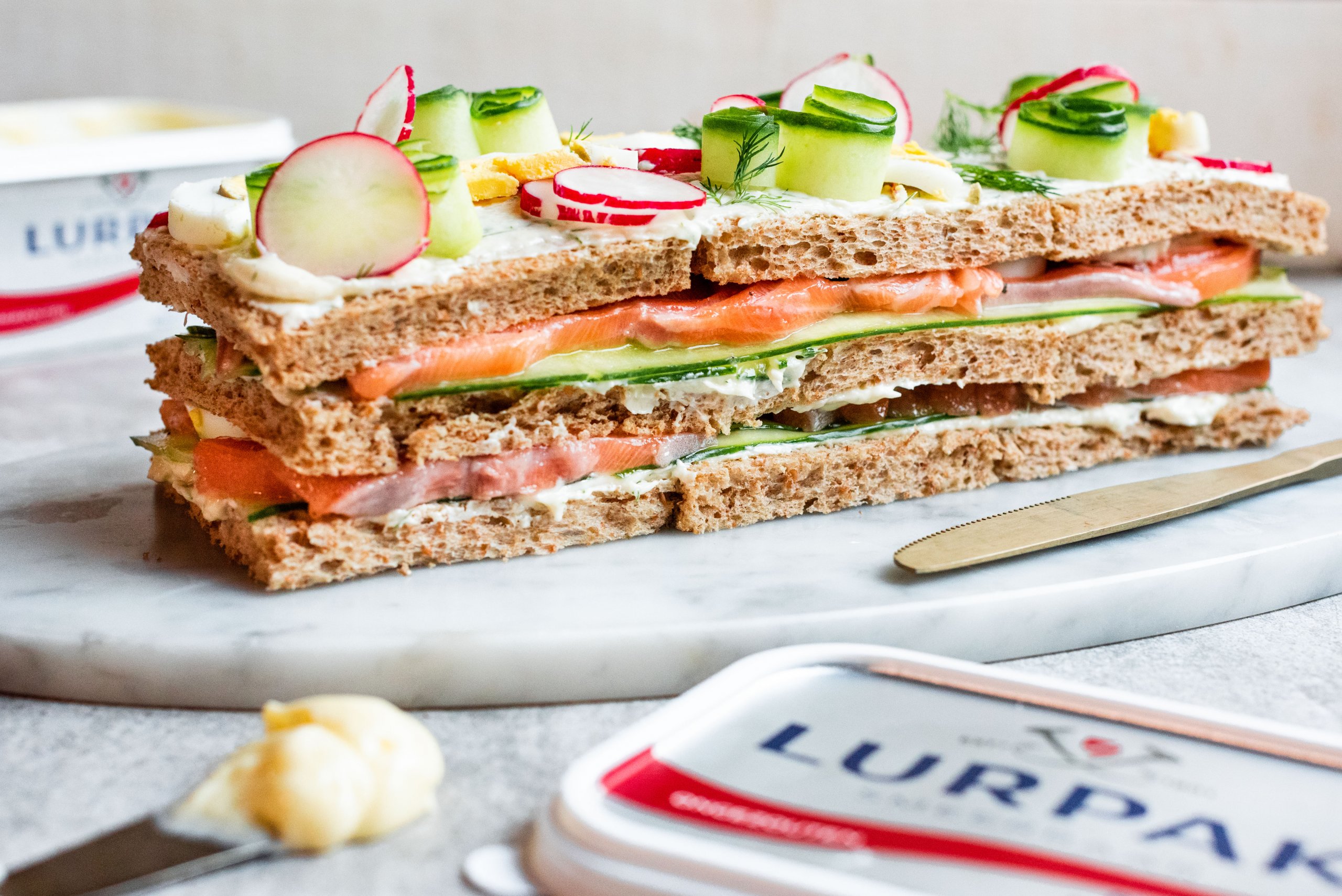Een plaatje om te zien en een traktatie om te eten, dat is deze sandwichtaart met gerookte zalm. Dankzij de combinatie van Lurpak smeerbaar gezouten, mierikswortel en verse dille geef je deze taart extra veel smaak.