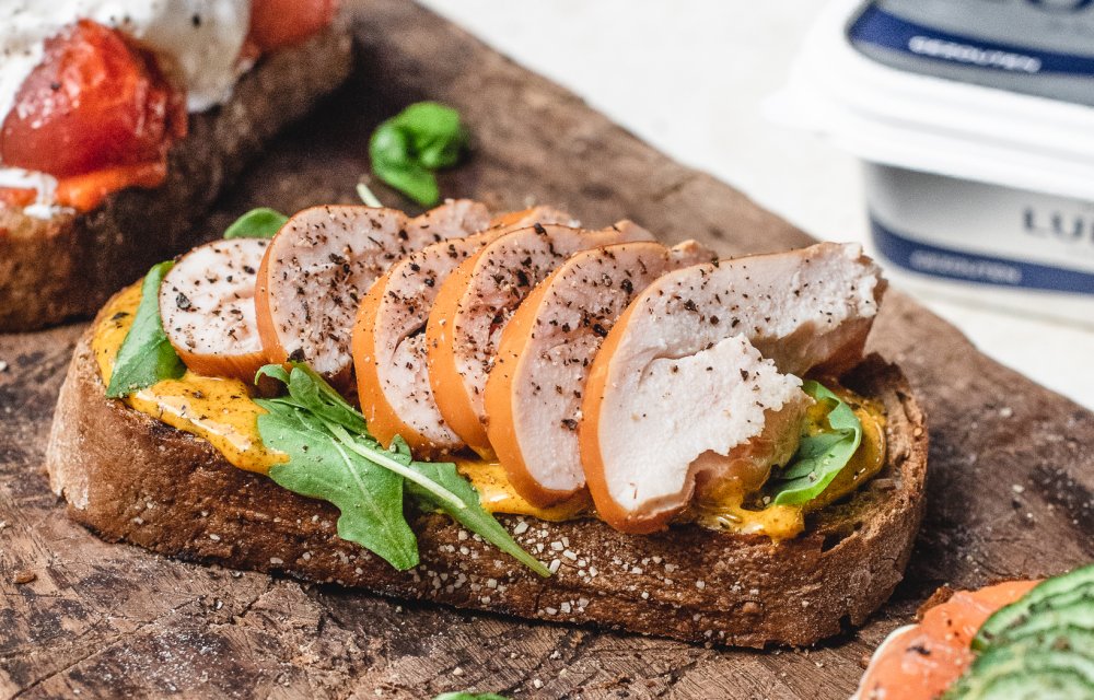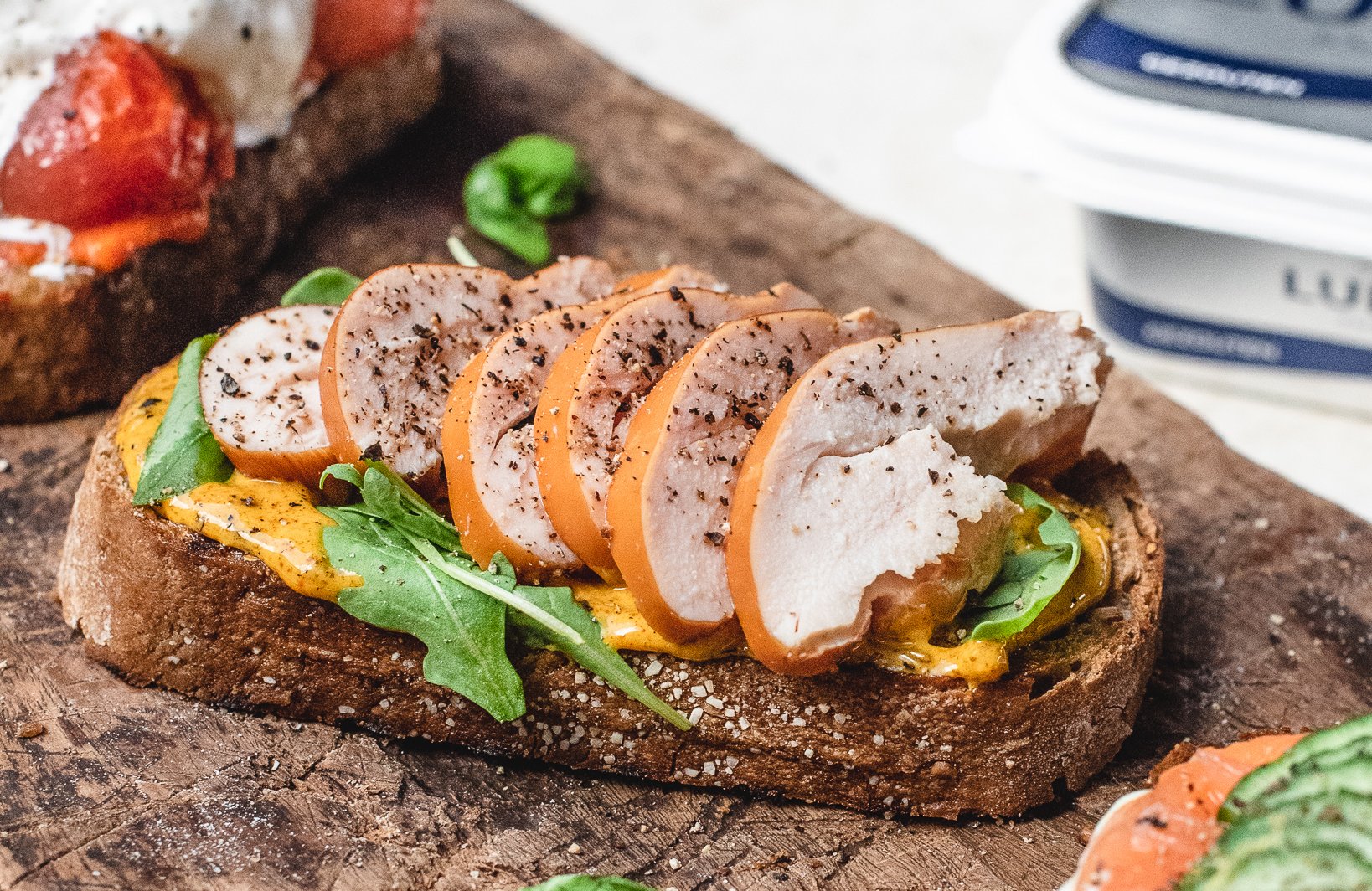 - Snijd de kipfilet in plakjes. Verdeel de kerrieboter over de sneetjes speltbrood en top ze af met de kipfiletplakjes en rucola.