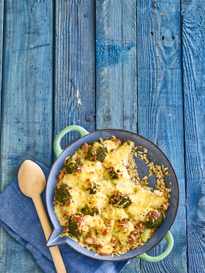 - Giet het water van de rijst af en strooi over de bodem van een ovenschaal. – Breng de rijst op smaak met wat olie en een snuf peper en zout en strooi hierover de broccoliroosjes en de kip.