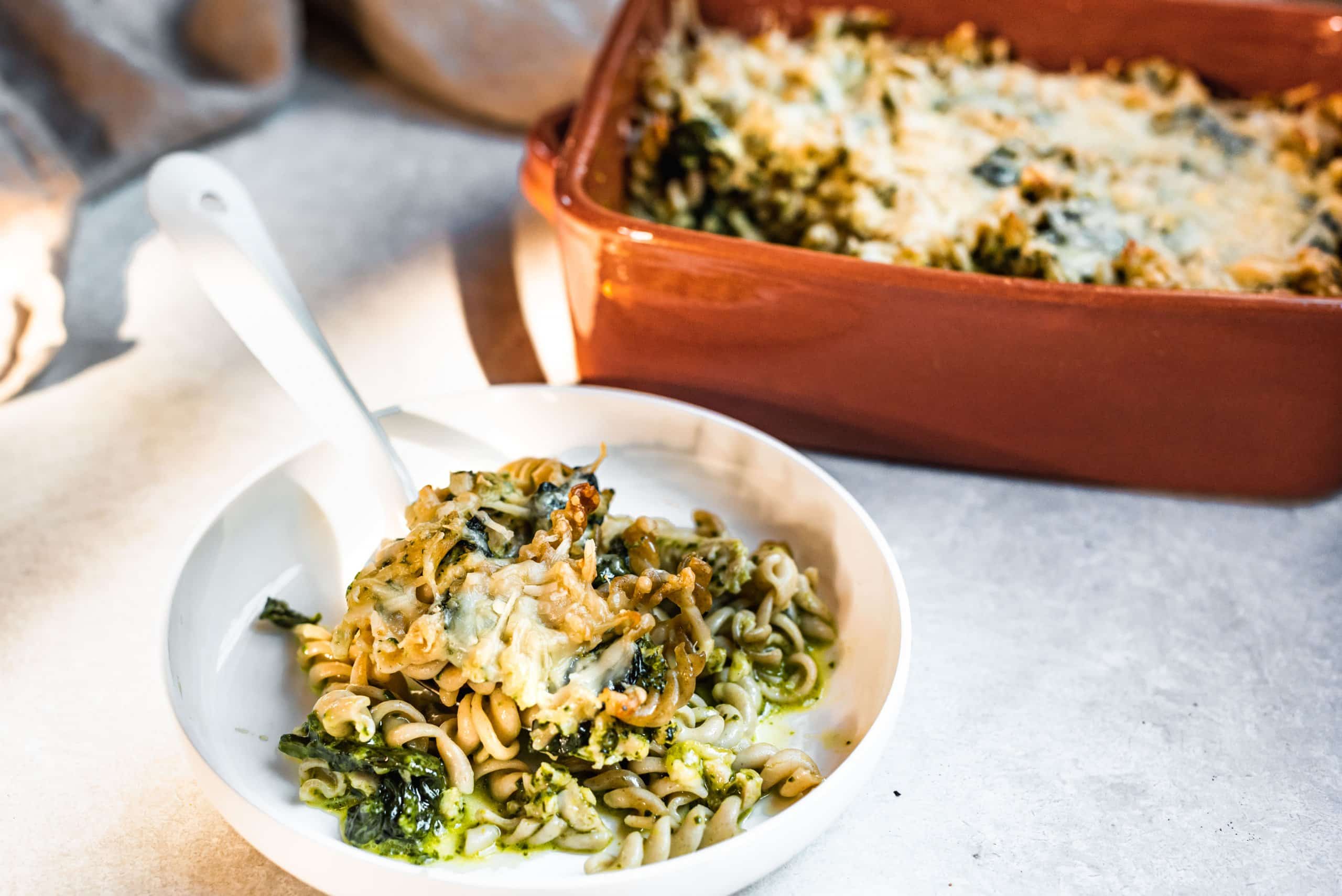 Met deze vega kip-pesto ovenschotel met 5 ingrediënten geven we een twist aan de klassieke pasta pesto. De pesto maken we met kaas, knoflook en spinazie en we maken de schotel af met vegetarische kipstukjes. En je hebt er maar een kwartier werk aan. Het andere kwartier mag de oven z’n best doen. Ja, deze pasta is een echte topper om te maken op een drukke dag!